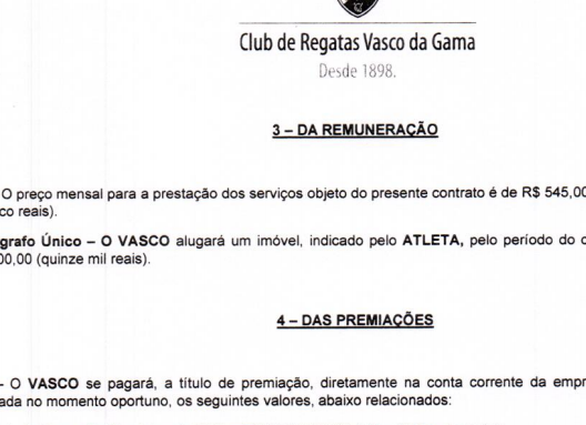 O contrato, com vigência de 1 de julho a 31 de dezembro de 2011, mostra que o jogador acertou receber o então salário mínimo (R$ 545) - o menor valor previsto por lei. E que só receberia outros valores como prêmios - se o Vasco fosse campeão brasileiro (R$ 3 milhões), ficasse entre os quatro primeiros (R$ 2 milhões) ou ganhasse o título da sul-americana (R$ 1 milhão). O clube também se comprometia a pagar o aluguel da moradia do jogador, no valor de R$ 15 mil. (Abaixo trecho do contrato de Juninho com o Vasco)