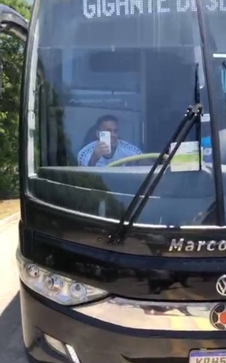 Léo Jabá na parte da frente do ônibus filmando a torcida.