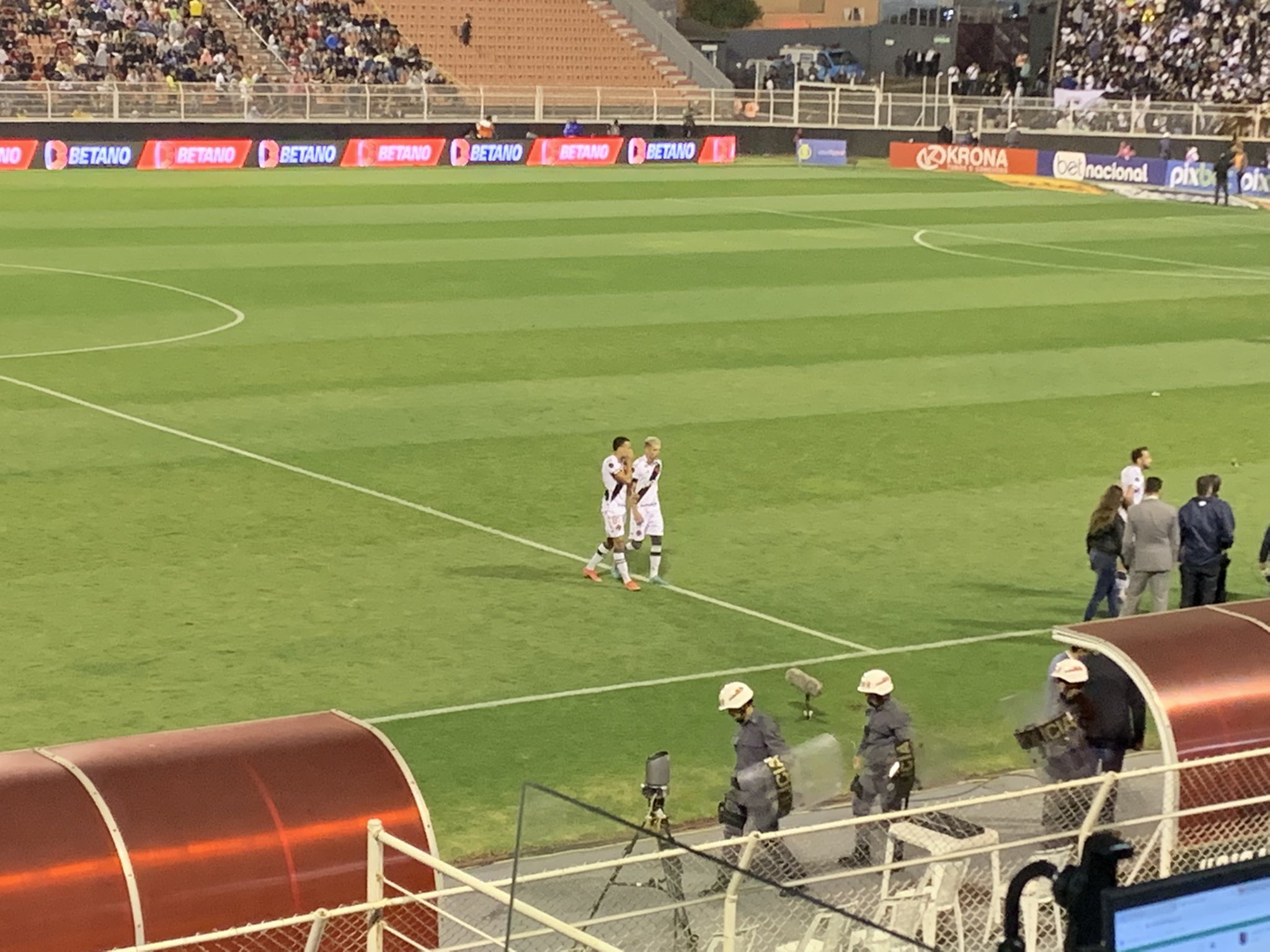 Luiz Henrique e Gabriel Pec deixam o campo conversando bastante. Atuação segura da dupla pelo lado esquerdo. Pec, por exemplo, vai pro intervalo com dois desarmes e participação no lance do pênalti #tritu