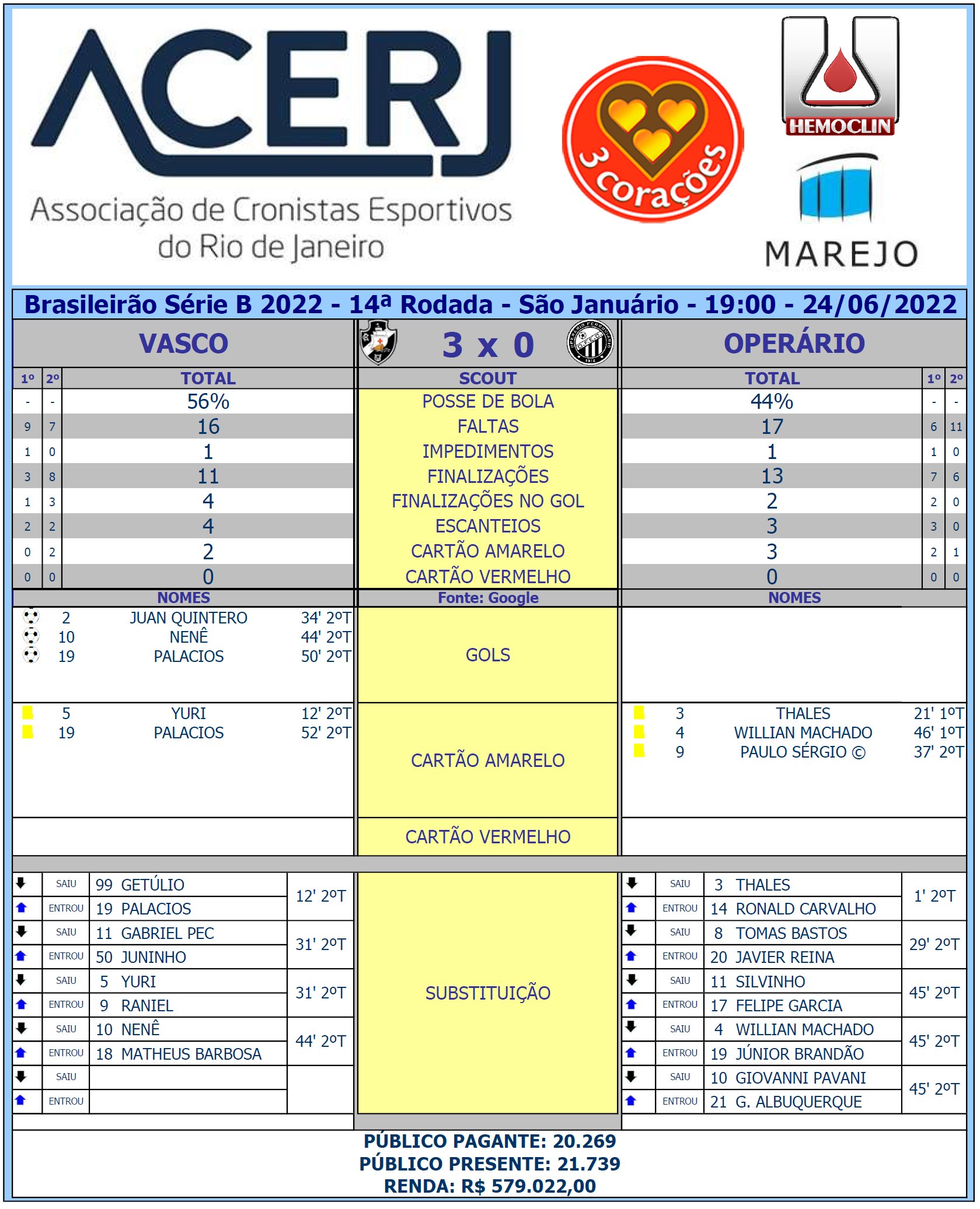 Scout Final de Vasco e Operário pela 14ª Rodada do Campeonato Brasileiro da Serie B 2022 em São Januário (Fonte: Google)