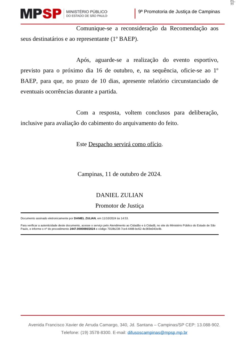 Ministerio Público de São Paulo reconsidera decisão e autoriza São Paulo e Vasco com duas torcidas. O Polícia de Campinas garantiu o jogo diante do reforço que virá da capital, sem prejuízo de apenas uma torcida estar em campo. Vendas devem começar hoje mesmo.