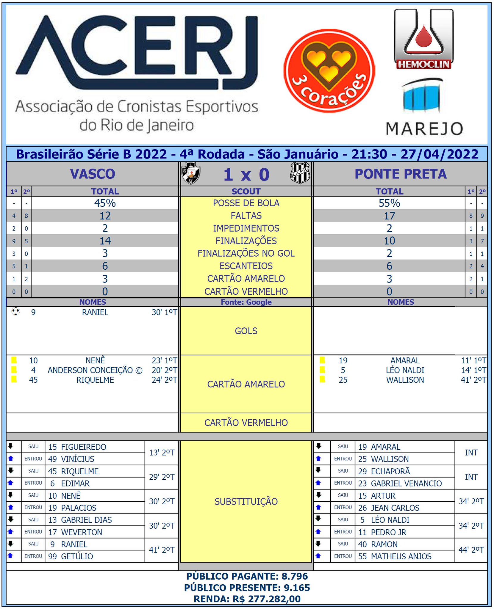 Scout Final de Vasco e Ponte Preta pela 4ª Rodada do Campeonato Brasileiro da Serie B 2022 em São Januário (Fonte: Google)
