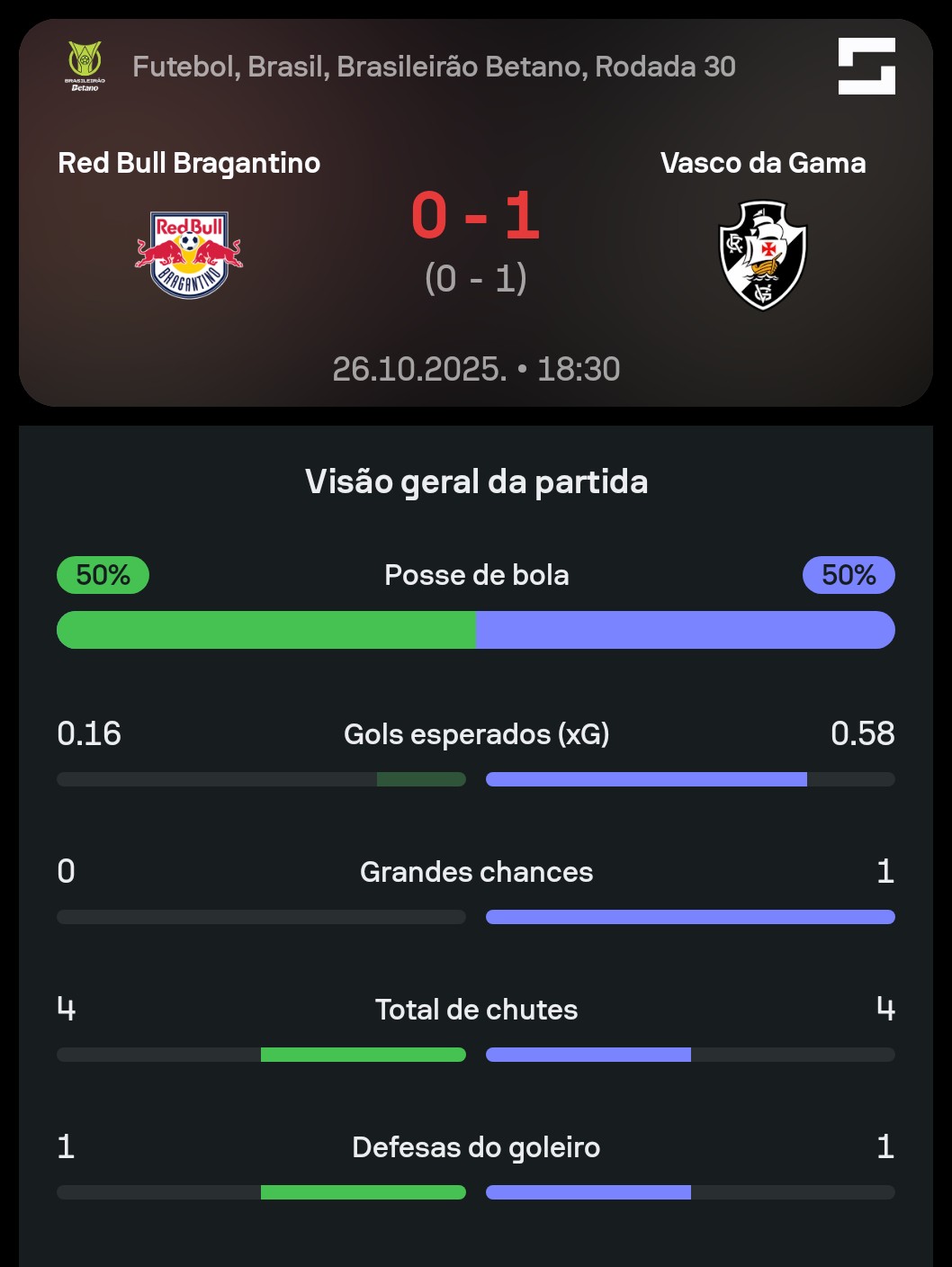 Final do 1º tempo de RB Bragantino 0-1 Vasco!
