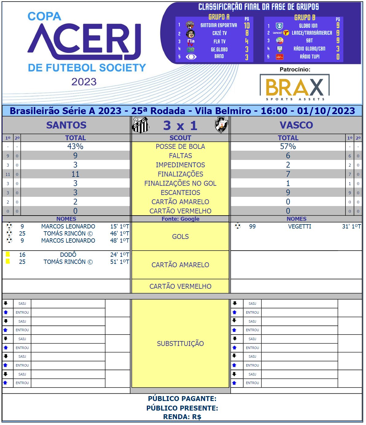 Scout do 1º Tempo de Santos e Vasco pela 25ª Rodada do Campeonato Brasileiro 2023 na Vila Belmiro (Fonte: Google) #Acerjinforma #Brasileirao #SANxVAS #SantosFC #Vasco