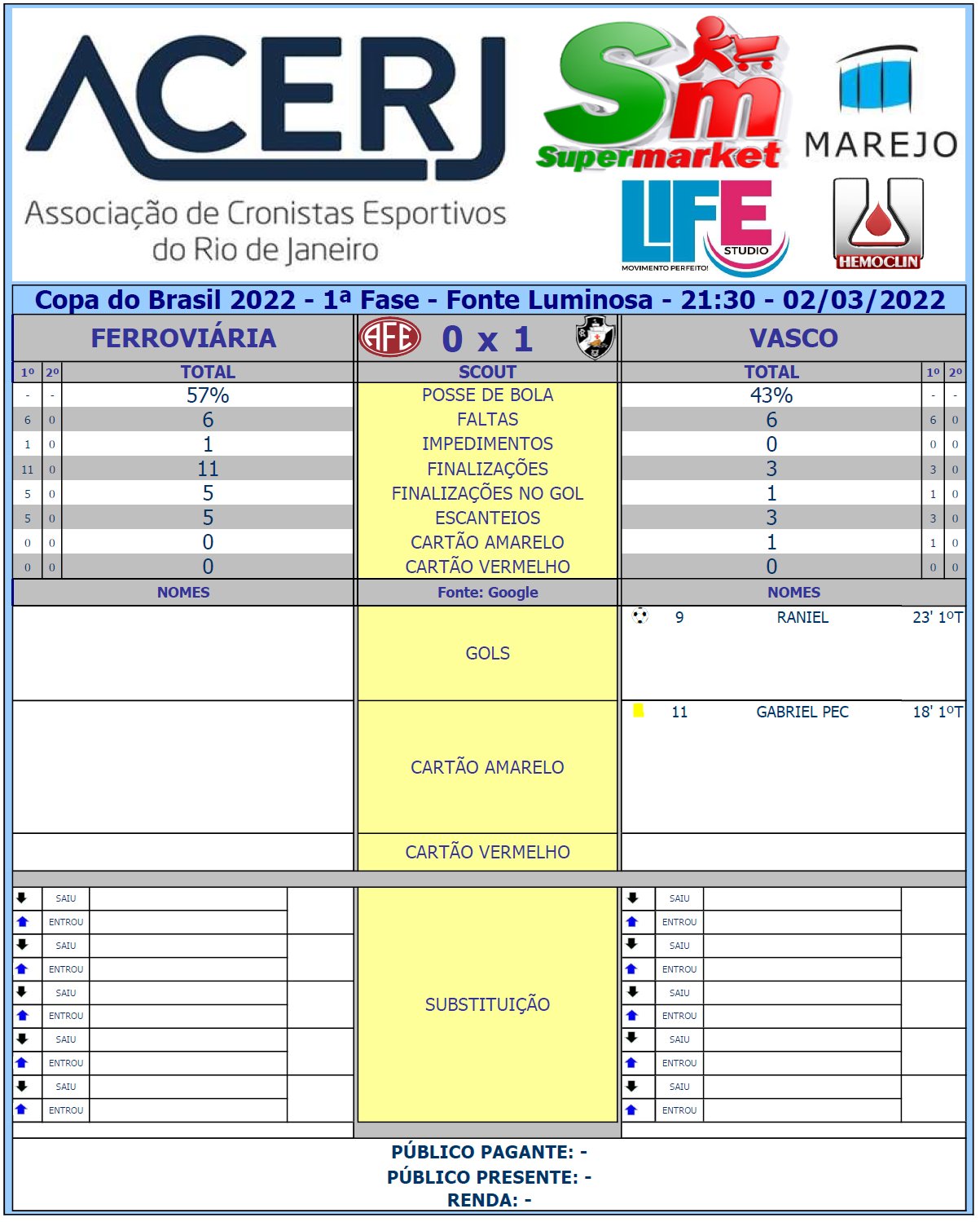 Scout do 1º Tempo de Ferroviária e Vasco pela 1ª Fase da Copa do Brasil 2022 na Fonte Luminosa