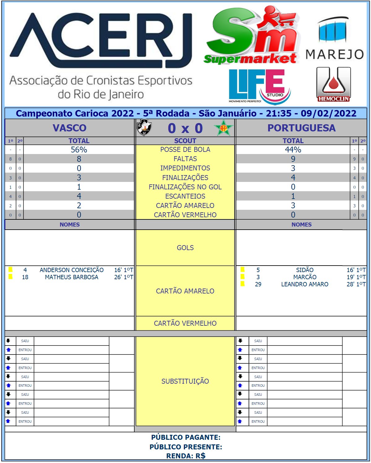 Scout do 1º Tempo de Vasco e Portuguesa pela 5ª Rodada do Campeonato Carioca 2022 em São Januário