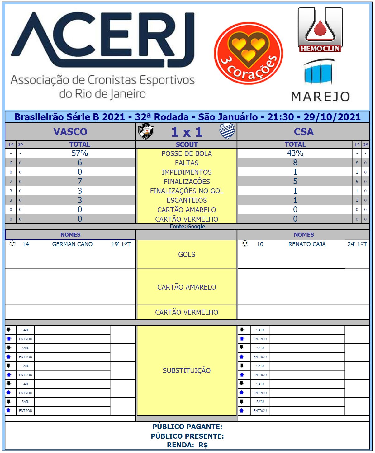 Scout do 1º Tempo de Vasco e CSA pela 32ª Rodada do Campeonato Brasileiro da Série B 2021 em São Januário (Fonte: Google)