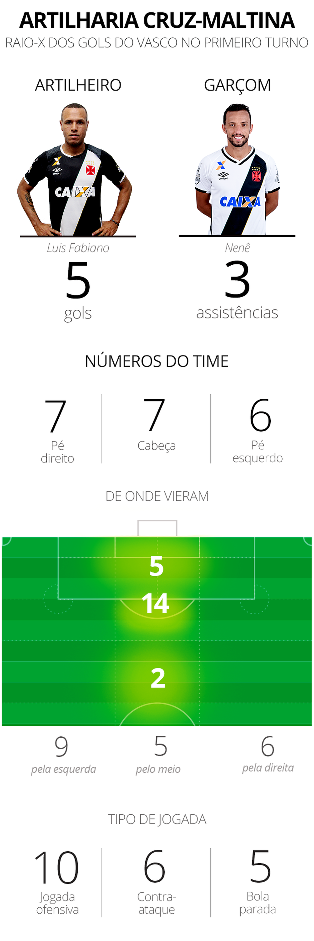 O GloboEsporte.com detalhou todos os gols marcados pelo Vasco no Brasileiro. Nele é possível tirar conclusões interessantes: a maioria deles saiu em lances de contra-ataque ou bola parada (11) do que em jogadas criadas (10).