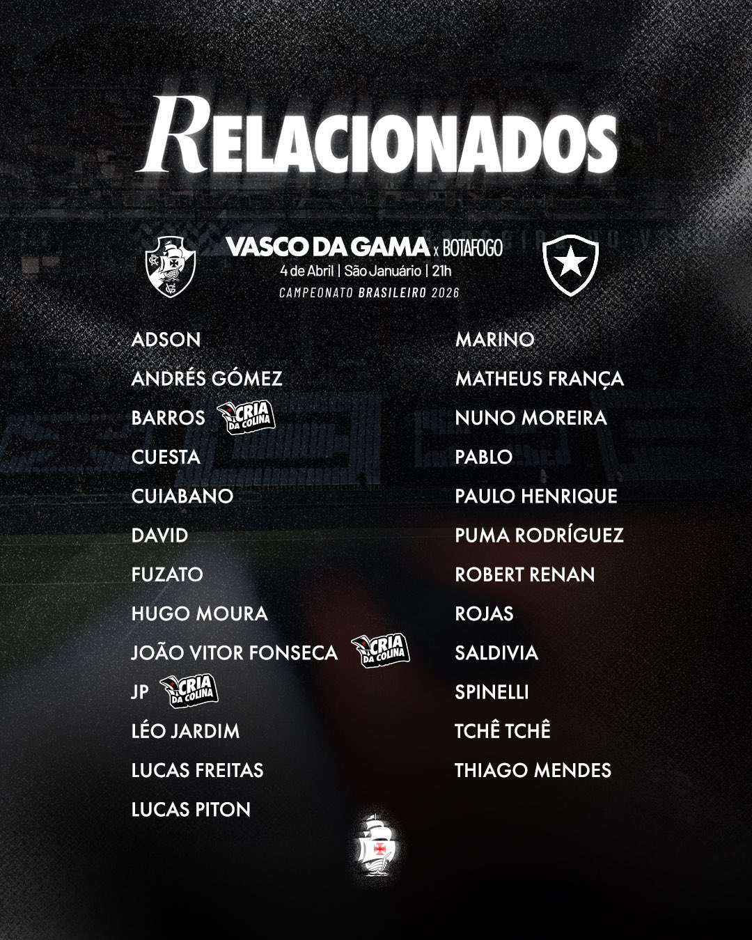 📋 Relacionados do Vasco da Gama para enfrentar o Botafogo 💢