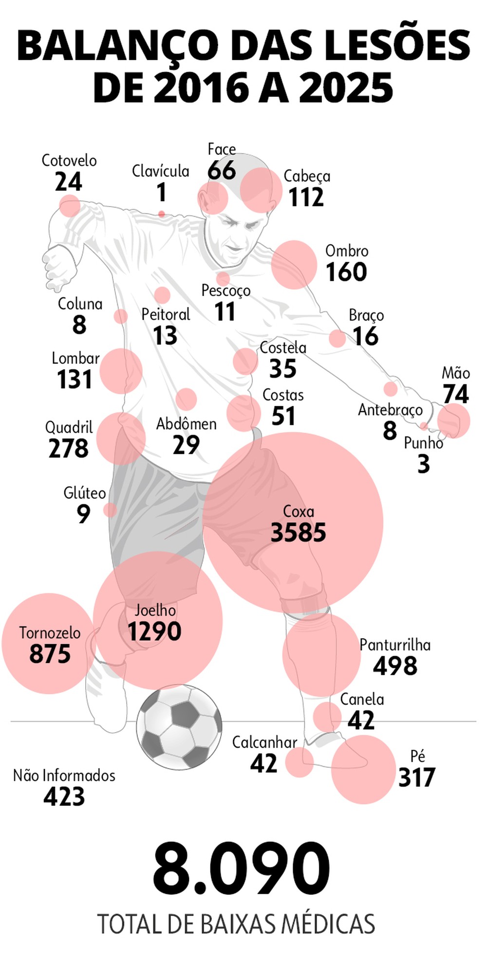 Ao todo, foram 3.585 problemas musculares na coxa entre 2016 e 2025. As contusões no joelho aparecem em segundo lugar: 1.290 casos. Lesões no tornozelo (875) e panturrilha (498) também foram destaques no período. Veja o infográfico detalhado abaixo: