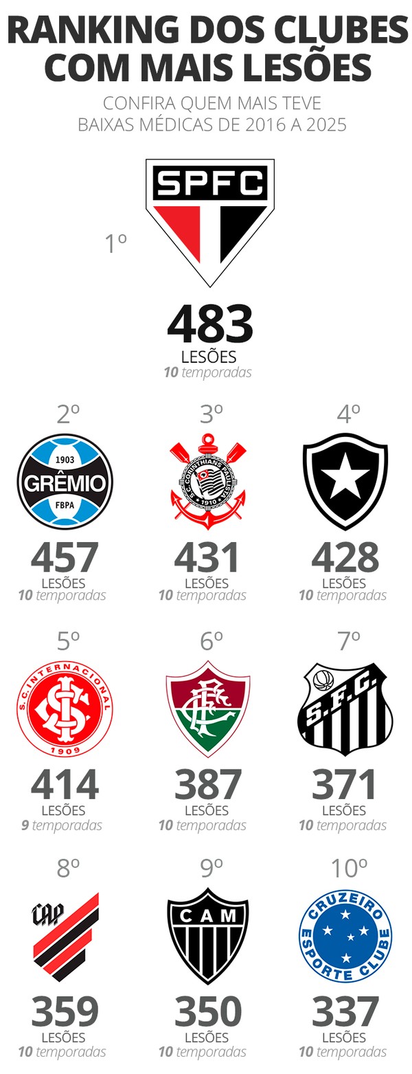 Entre 2016 e 2025, o São Paulo liderou as baixas ao departamento médico na elite do futebol brasileiro (veja a lista completa na metodologia), com 483 casos registrados ao longo de 10 temporadas, o que representa uma média de 48,3 lesões por ano. O time que mais se aproxima é outro tricolor: o Grêmio, com 457 vetos clínicos no mesmo período.