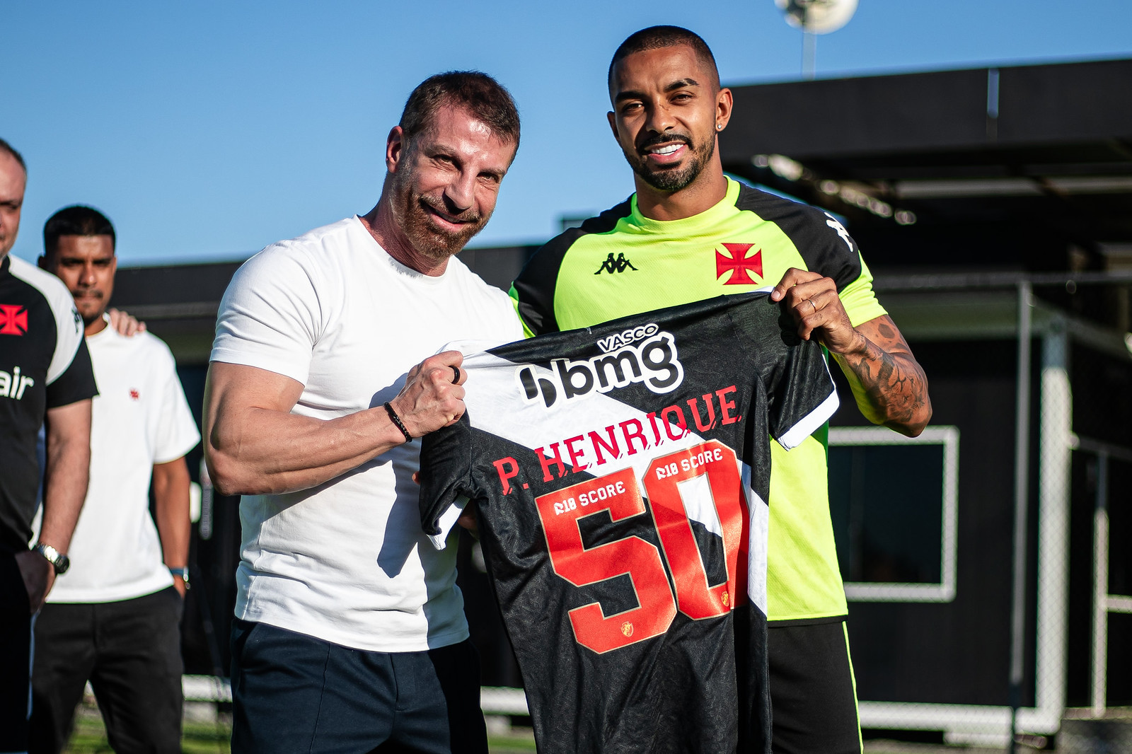 O lateral-direito Paulo Henrique recebeu diretamente do Presidente Pedrinho a sua camisa especial em comemoração aos 5️⃣0️⃣ jogos pelo Vasco da Gama! 💢