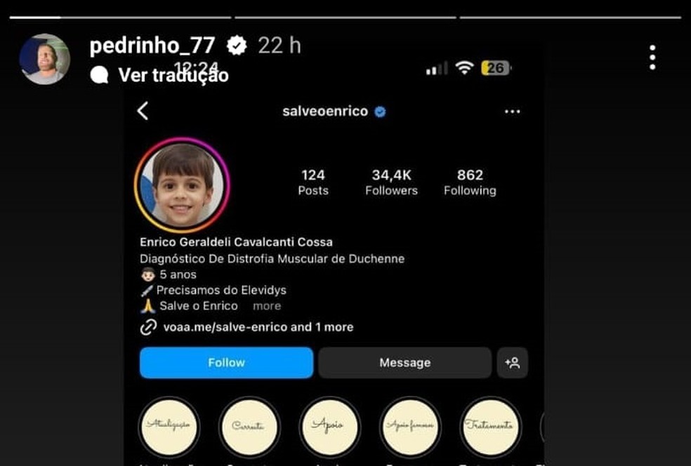 Pedrinho fez a publicação da ação nomeada como “Salve o Enrico”, referente ao menino de cinco anos, morador de Varginha (MG), que foi diagnosticado com Distrofia Muscular de Duchenne.