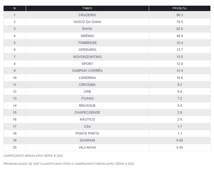 A probabilidade de acesso do Vasco caiu de 86,4% para 76,5%, de acordo com os cálculos da página Probabilidade no Futebol, mantida pela UFMG.