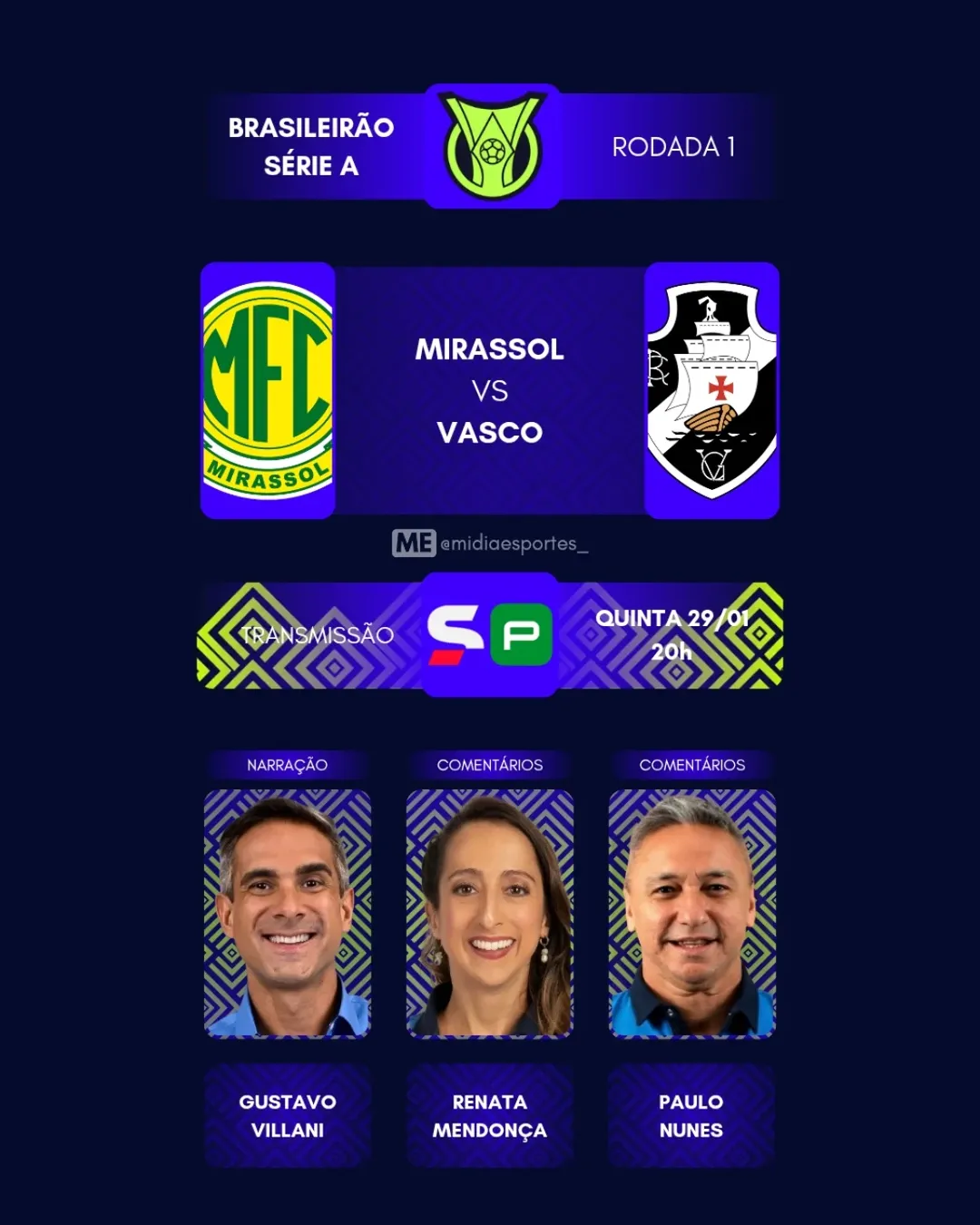 Profissionais que participarão da transmissão de Mirassol x Vasco