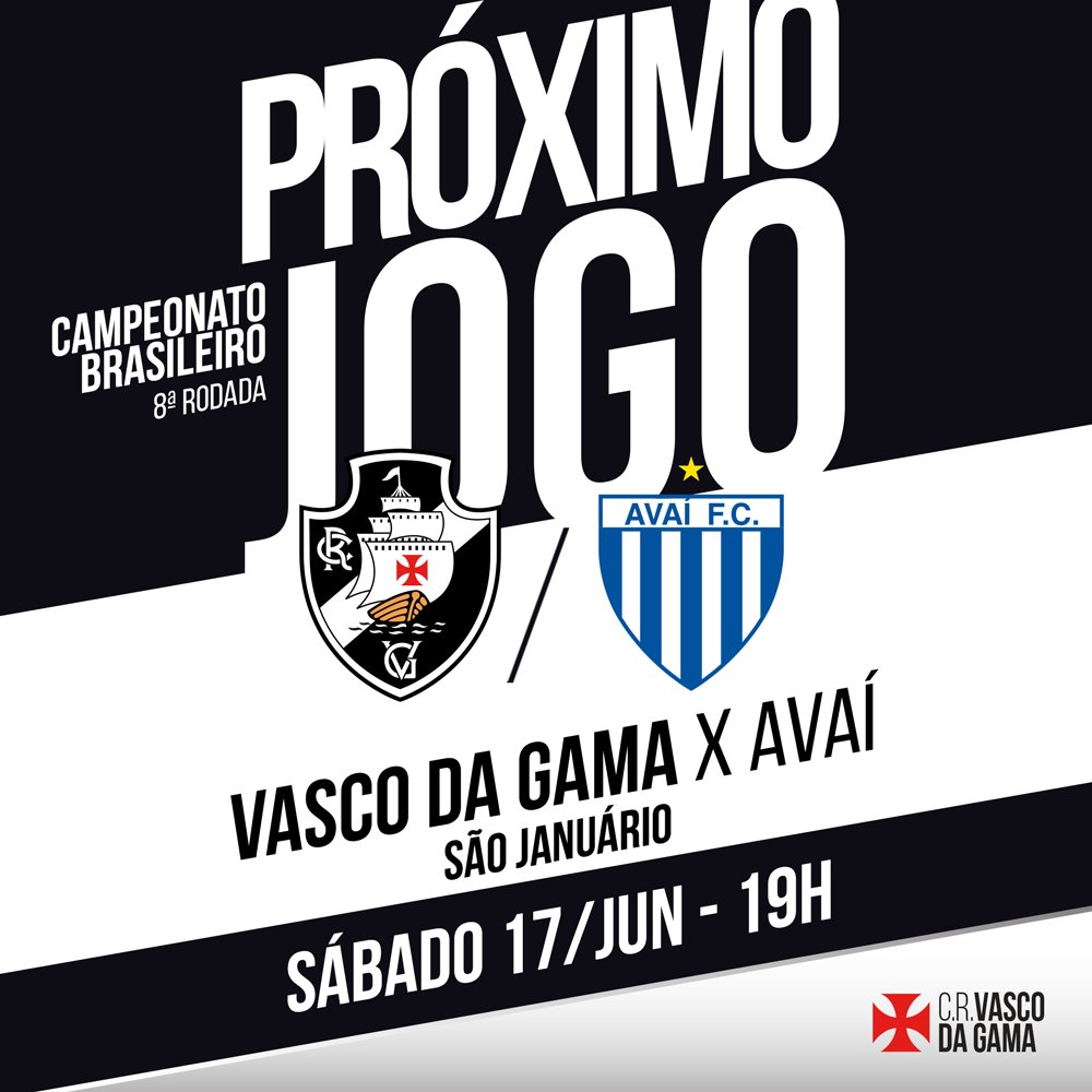 O próximo jogo do Vasco será contra o Avaí, no sábado, em São Januário. #EstamosJuntosVasco