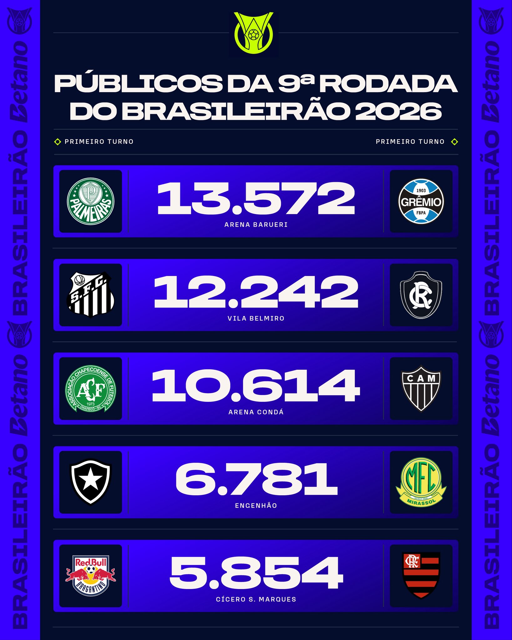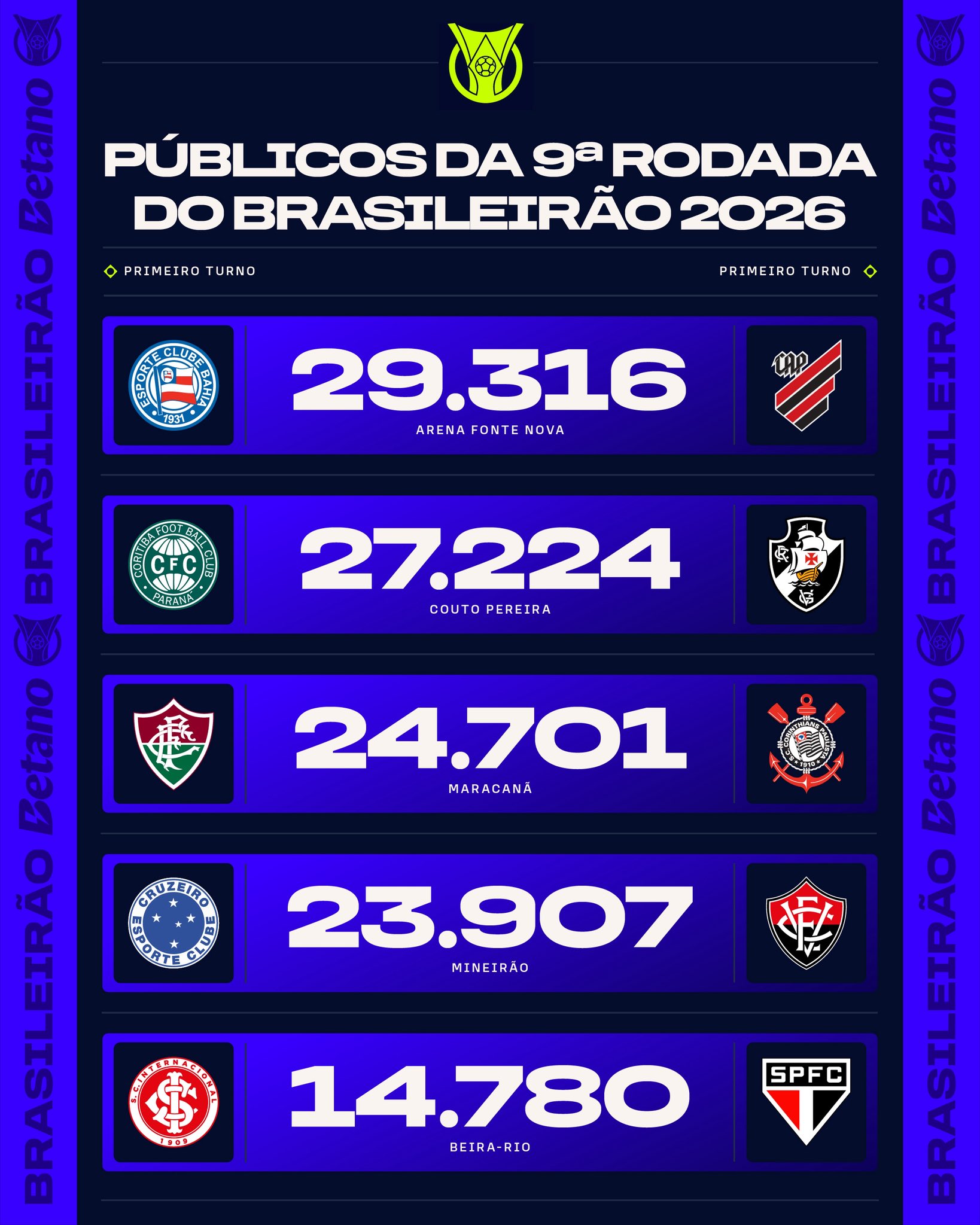 🏟️A torcida segue dando show! Confira o público da 9ª rodada do Brasileirão Betano 2026 ! 🏟️🔥