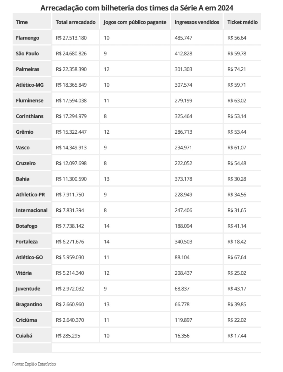 Veja os números dos times da Série A:
