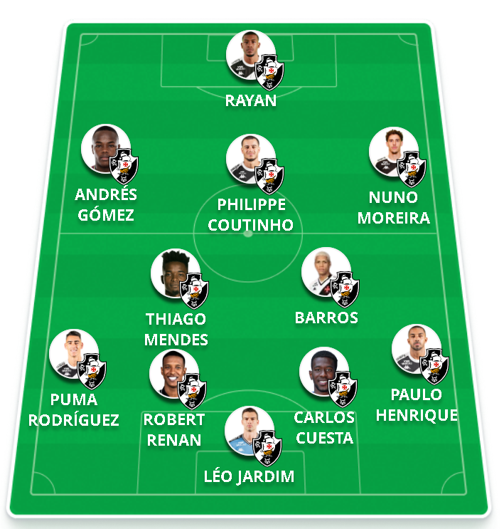 Provável escalação: Léo Jardim, Paulo Henrique, Cuesta, Robert Renan, Puma (Piton); Thiago Mendes, Barros, Coutinho, Andrés Gómez, Rayan e Nuno Moreira.