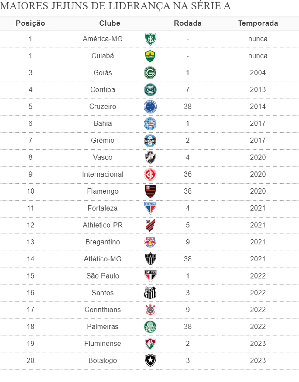 O ranking abaixo mostra qual foi a última vez que as equipes da Série A deste ano ocuparam a liderança do Brasileirão por pontos corridos, desde 2003, considerando a tabela original, após todos os jogos serem realizados, apesar de possíveis adiamentos.