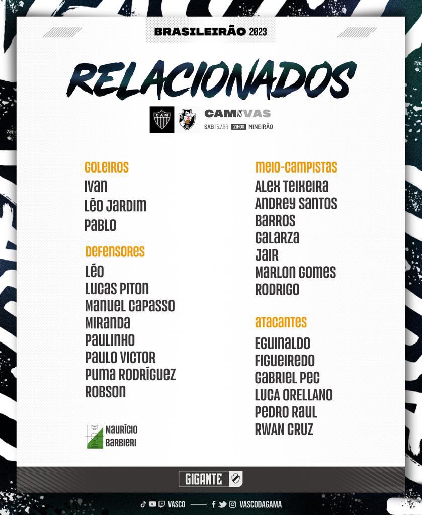 Relacionados do Vasco para enfrentar o Atlético-MG