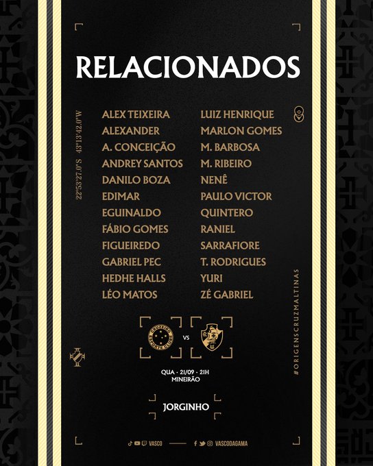 📝 Lista de relacionados para o duelo contra o Cruzeiro (MG).