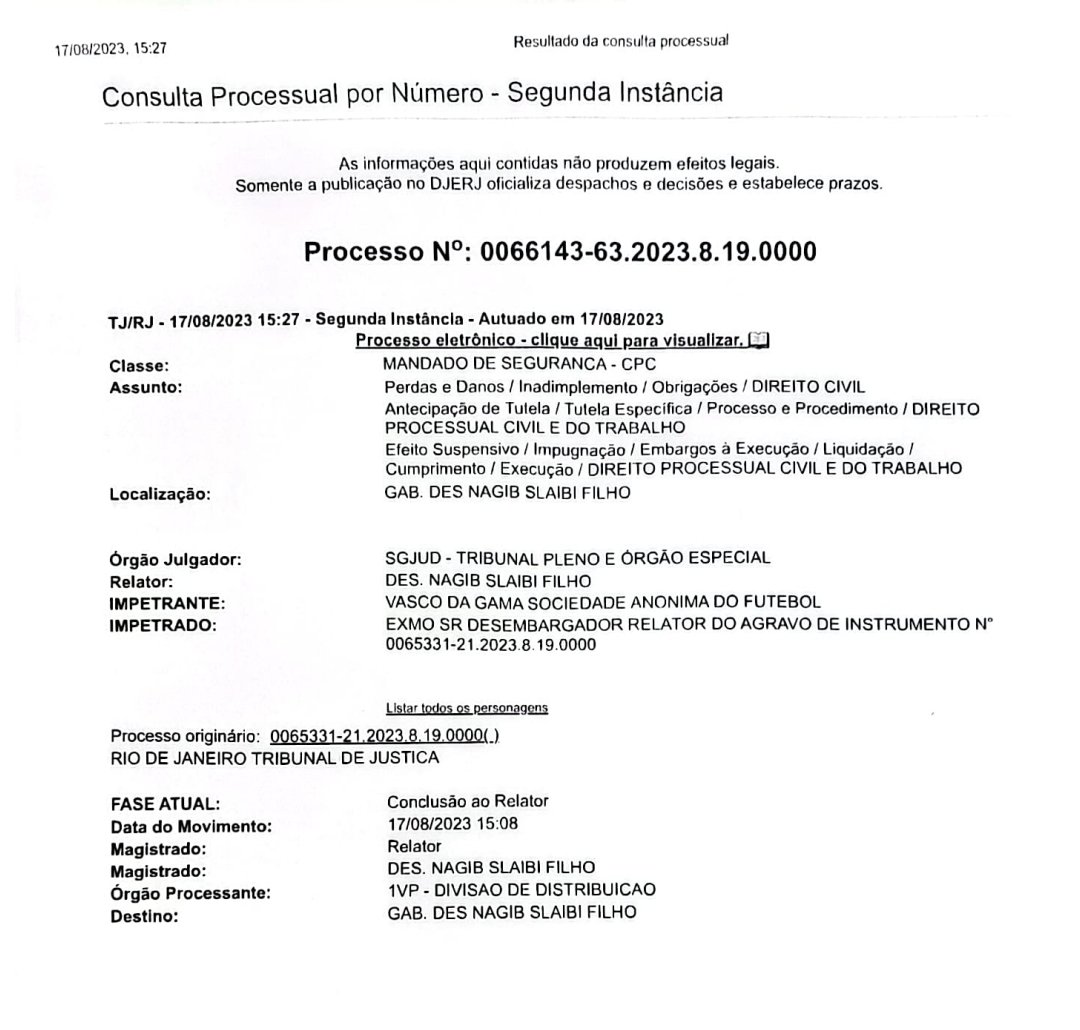 Relator recebe Mandado de Segurança e Vasco aguarda decisão