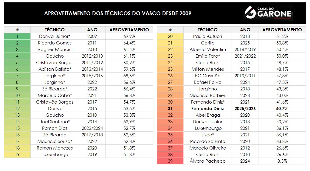 Diniz deixa o Vasco com o 31º PIOR aproveitamento entre os últimos 39 trabalhos de um treinador do clube. Rendimento foi inferior inclusive ao de sua primeira passagem por São Januário.