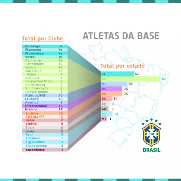 Abaixo, você confere os números de jogadores que cada clube e estado cedeu à Seleção e, na sequência, quais foram as equipes estrangeiras que tiveram atletas convocados.