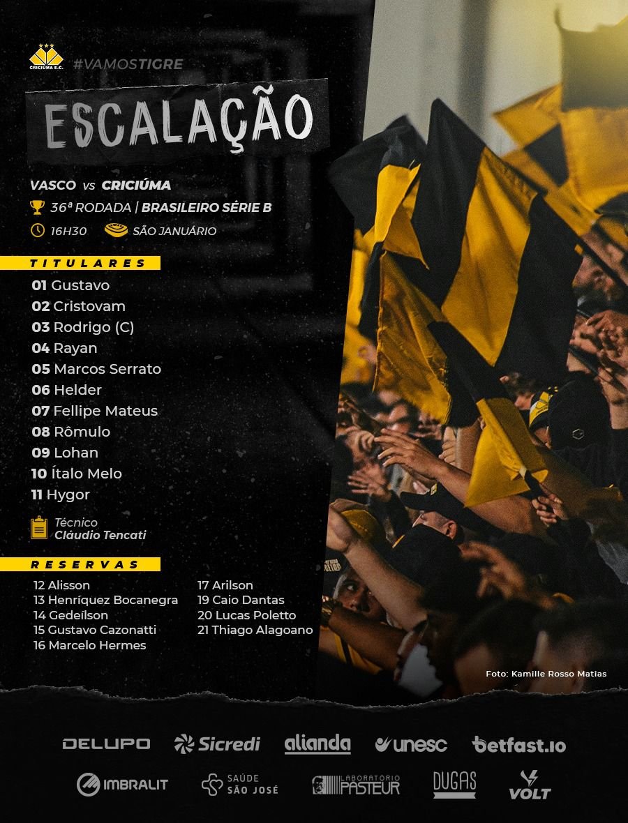 Rival: Criciúma escalado para enfrentar o Vasco