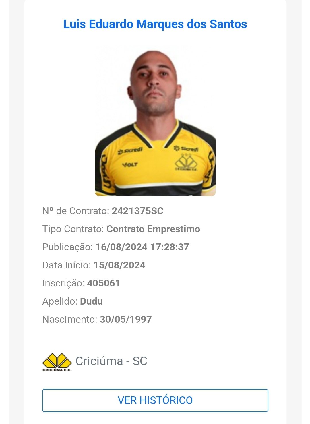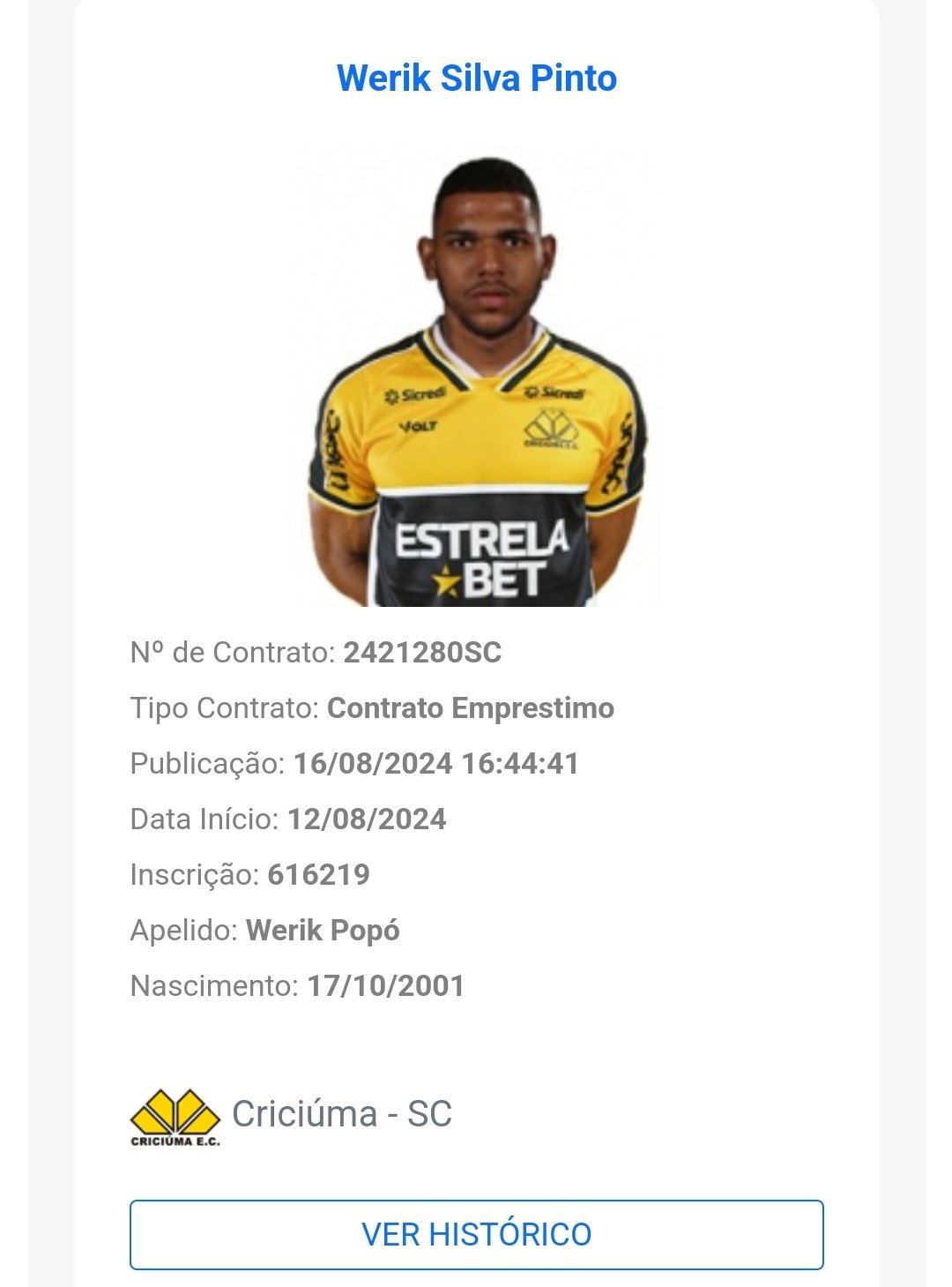 O lateral-direito Dudu e atacante Werik Popó estão regularizados pelo Criciúma, junto ao BID da CBF. Com isso, os dois já podem estrear pelo Tigre contra o Vasco, no domingo, às 16h.