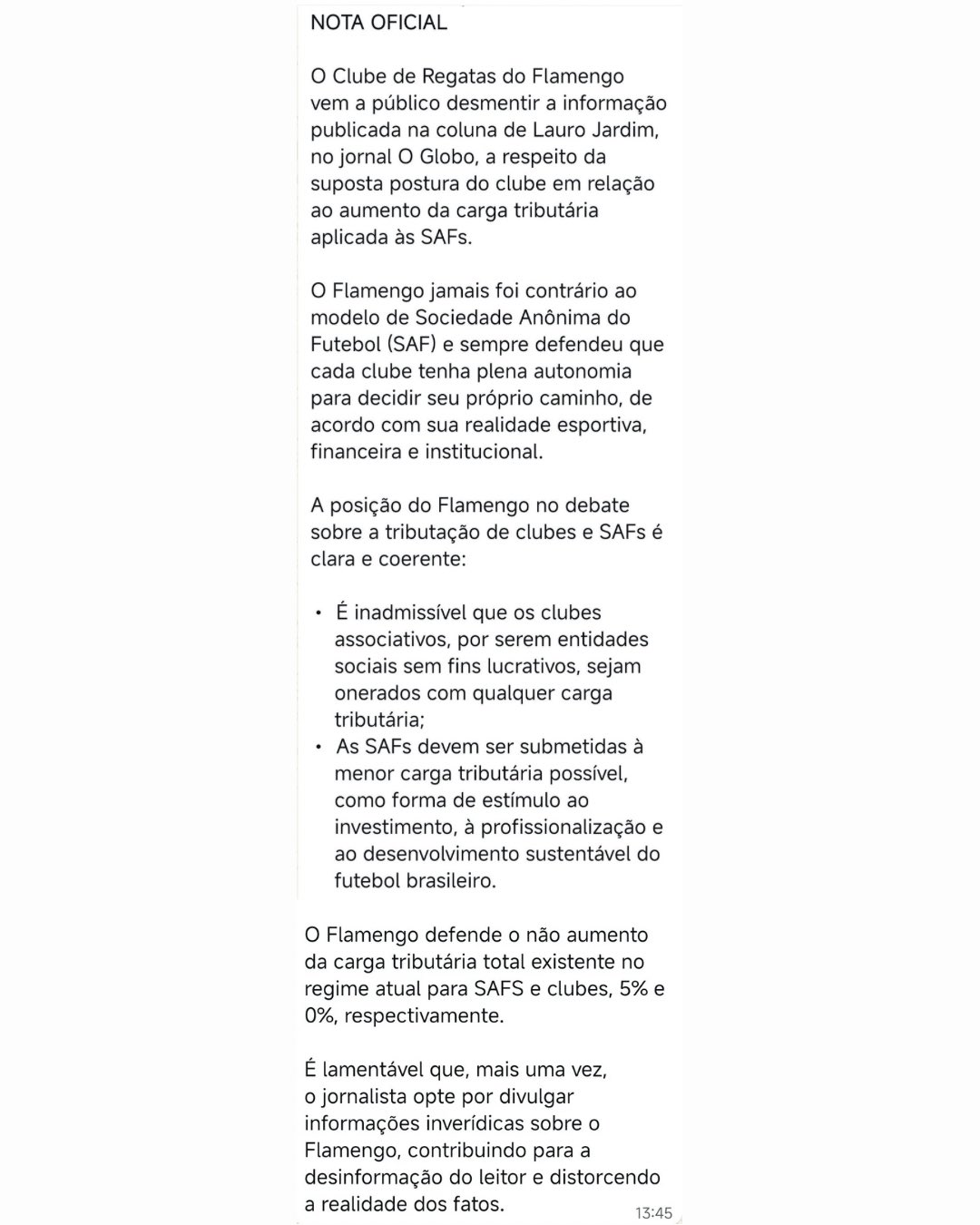 O Flamengo soltou uma nota desmentindo a notícia do Lauro Jardim de que o Flamengo estaria trabalhando para um aumento de carga tributária aplicada as SAFs.