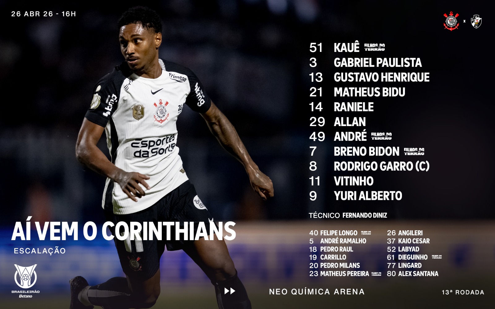 Rival: Escalação do Corinthians para o duelo contra o Vasco