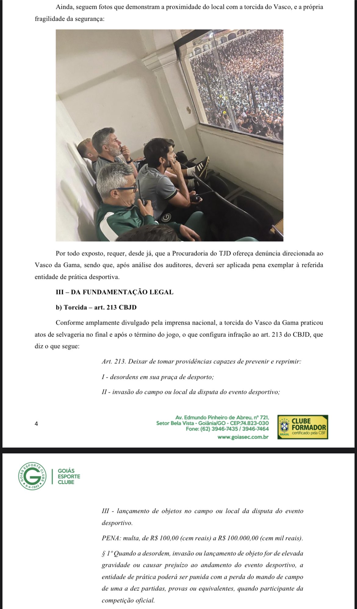 O Goiás entrou com uma “Notícia de Infração Disciplinar” contra o Vasco no STJD e pediu punição ao time carioca por conta do ocorrido em São Januário. O Esmeraldino alega que a torcida vascaína praticou “atos de selvageria” e também “ausência de infraestrutura” no estádio.