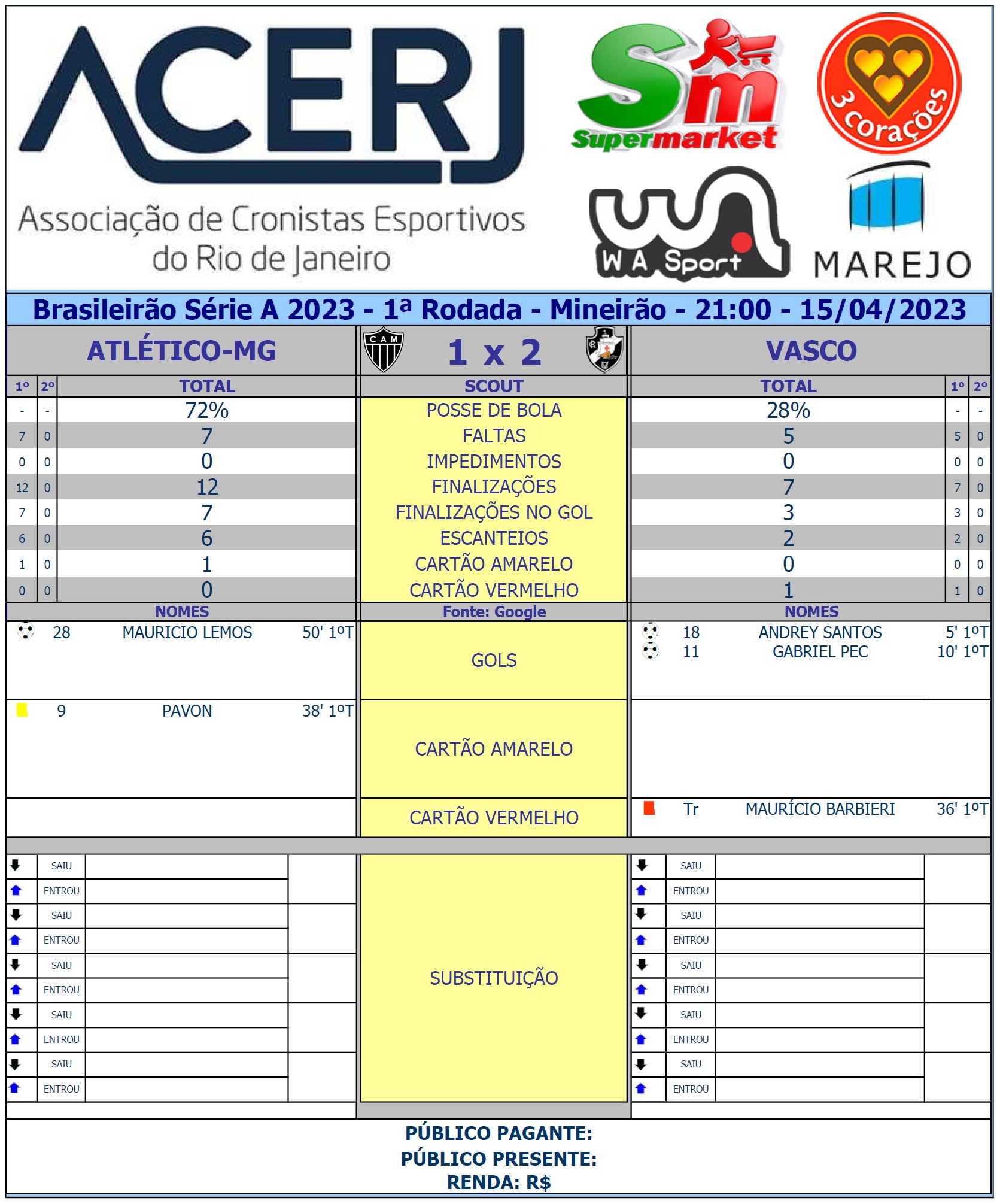 Scout do 1º Tempo de Atlético-MG e Vasco pela 1ª Rodada do Campeonato Brasileiro 2023 no Mineirão (Fonte: Google) #Acerjinforma #Brasileirao #CAMxVAS #AtleticoMG #Vasco @Brasileirao @Atletico @VascodaGama