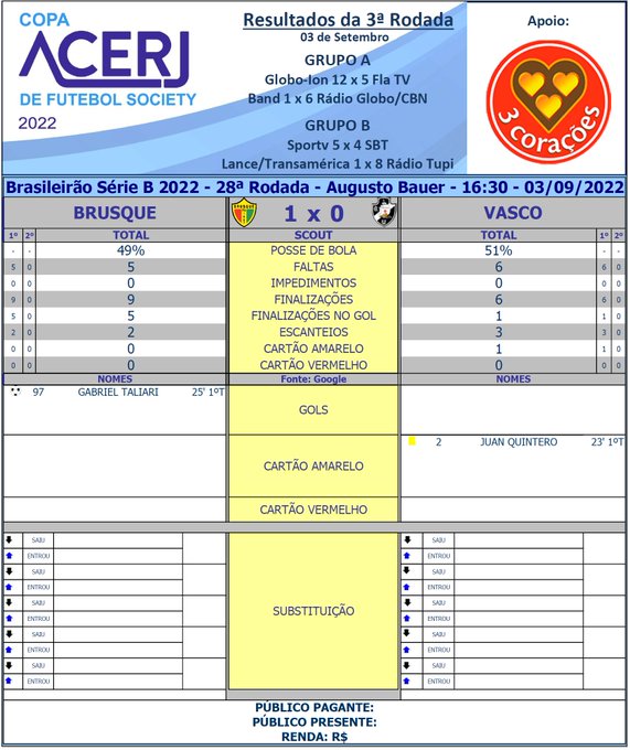 Scout do 1º Tempo de Brusque e Vasco pela 28ª Rodada do Campeonato Brasileiro da Serie B 2022 no Augusto Bauer (Fonte: Google) #Acerjinforma #BrasileiraoSerieB #BRUxVAS #BrusqueFC #Vasco @BrasileiraoB @Brusqueoficial @VascodaGama