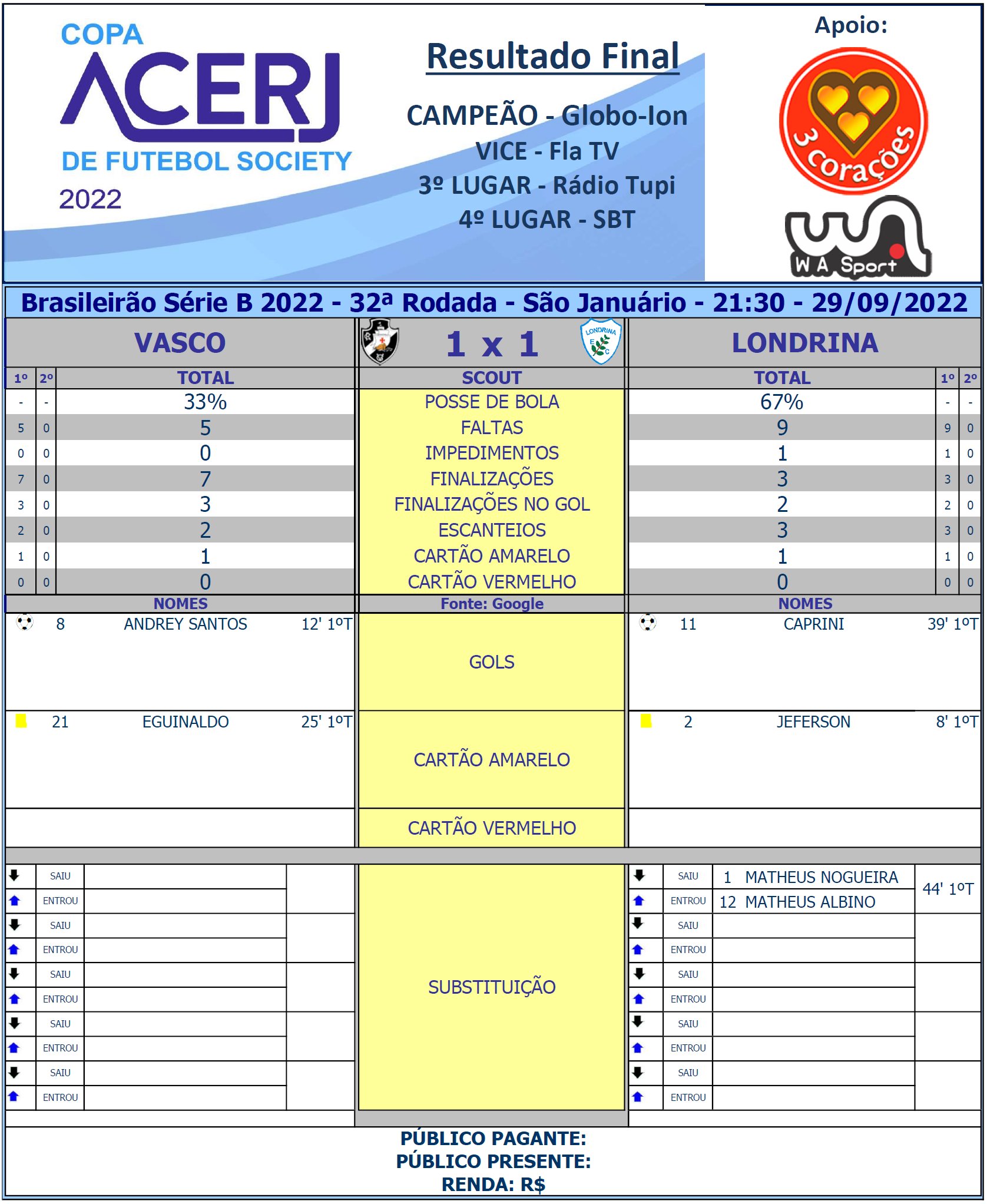 Scout do 1º Tempo de Vasco e londrina pela 32ª Rodada do Campeonato Brasileiro da Serie B 2022 em São Januário (Fonte: Google) #Acerjinforma #BrasileiraoSerieB #VASxLON #Vasco #LondrinaEC @BrasileiraoB @VascodaGama @LondrinaEC