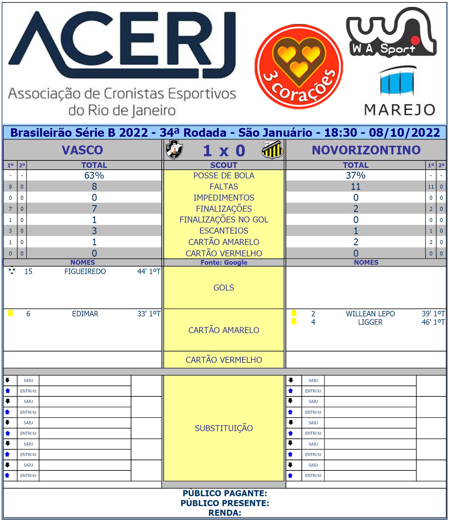 Scout do 1º Tempo de Vasco e Novorizontino pela 34ª Rodada do Campeonato Brasileiro da série B 2022 em São Januário #Acerjinforma #BrasileiraoSerieB #VASxNOV @BrasileiraoB @VascodaGama @novorizontino