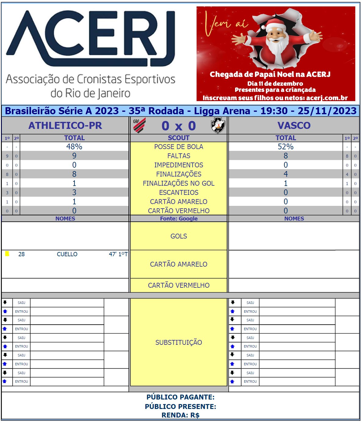 Scout do 1º Tempo de Athletico-PR e Vasco pela 35ª Rodada do Campeonato Brasileiro 2023 na Ligga Arena (Fonte: Google) #Acerjinforma #Brasileirao #CAPxVAS #AthleticoPR #VascodaGama @Brasileirao @AthleticoPR @VascodaGama