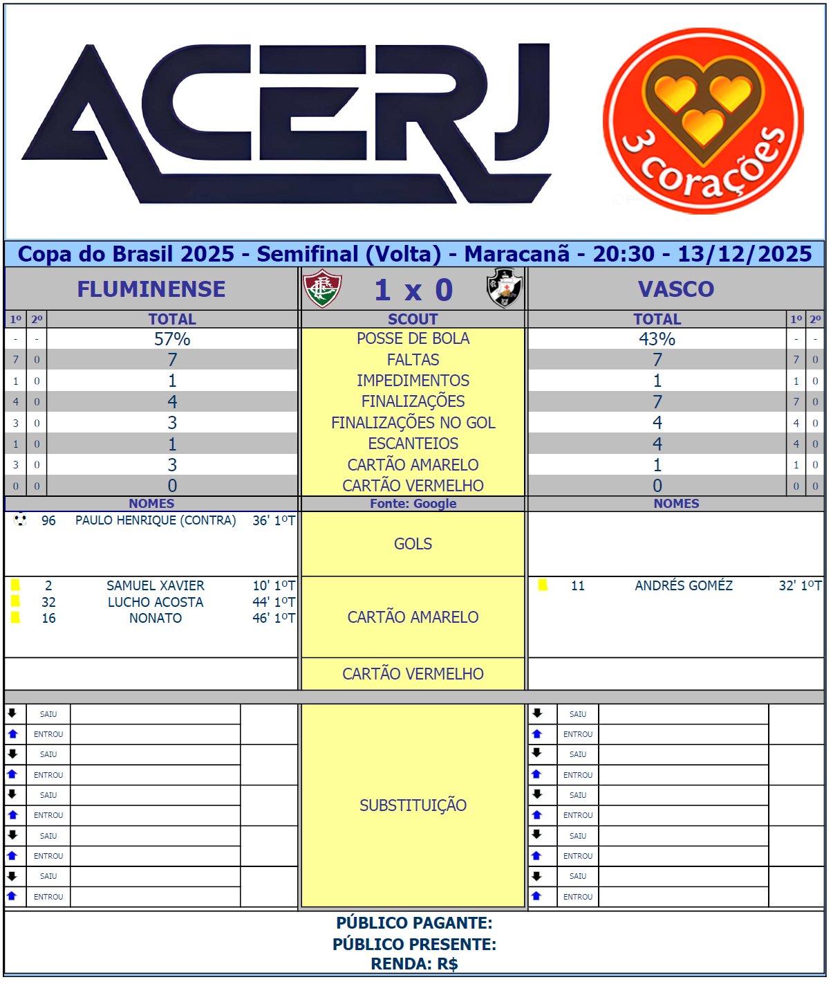 Scout do 1º Tempo de Fluminense e Vasco pelo jogo de volta das semifinais da Copa do Brasil 2025 no Maracanã (Fonte: Google) #Acerjinforma #CopaBetanoDoBrasil #FLUxVAS #Fluminense #VascodaGama @CopaDoBrasilCBF @FluminenseFC @VascodaGama