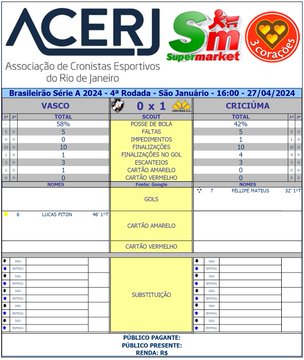 Scout do 1º Tempo de Vasco e Criciúma pela 4ª Rodada do Campeonato Brasileiro 2024 em São Januário (Fonte: Google) #Acerjinforma #brasileirao2024 #VASxCRI #Vasco #Criciuma