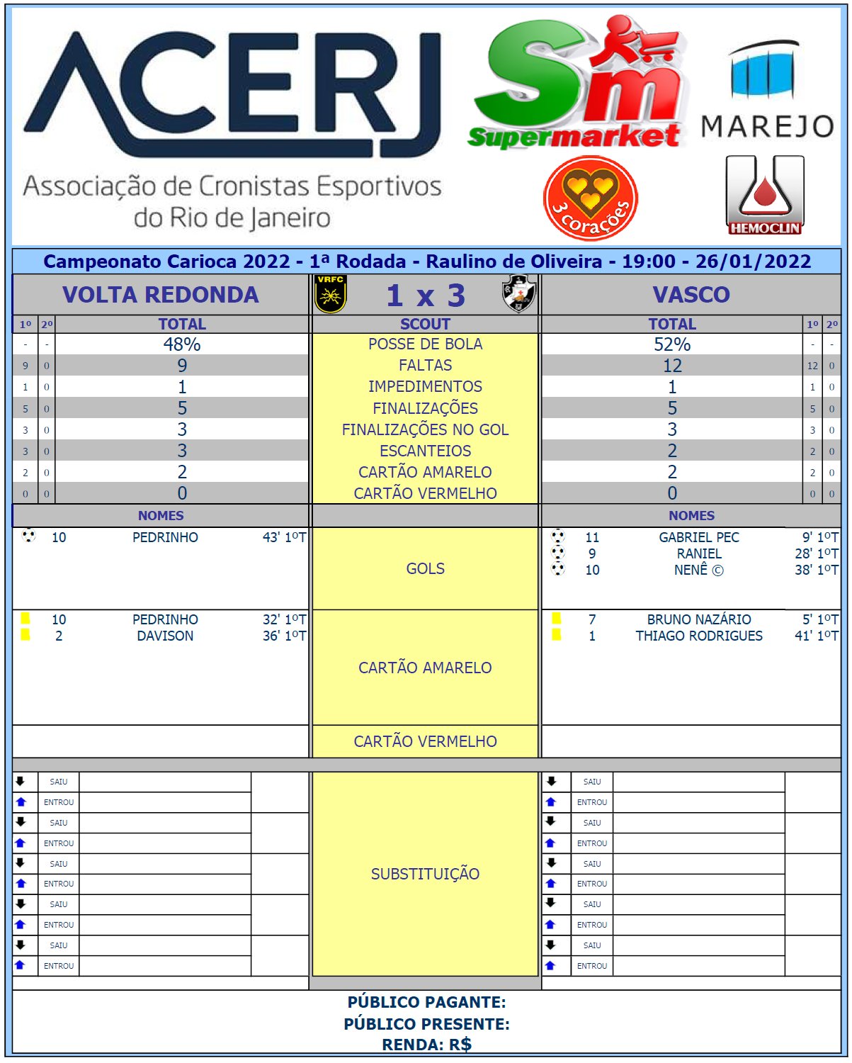 Scout do 1º Tempo de Volta Redonda e Vasco pela 1ª Rodada do Campeonato Carioca 2022 no Raulino de Oliveira #Acerjinforma #Cariocao2022 #VRExVAS #Voltaço #Vasco @Cariocao @VascodaGama @VoltacoFC