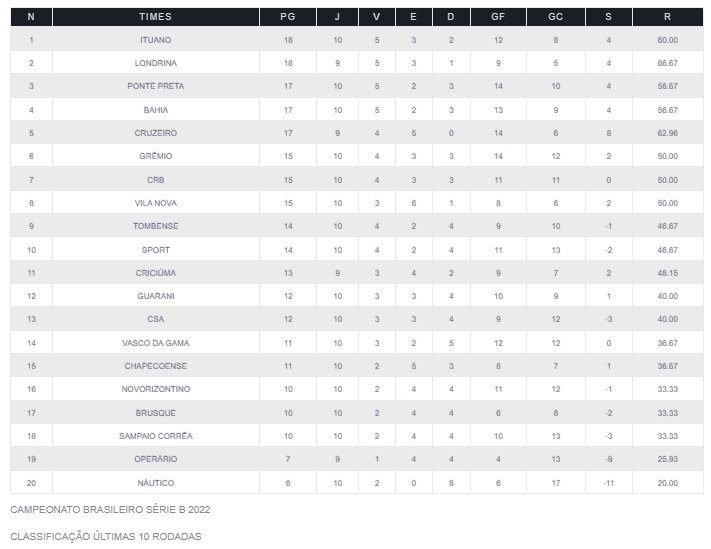 A classificação das últimas 10 rodadas da Série B. Pelo aproveitamento recente, Ituano e Londrina despontam como as principais ameaças ao G4.