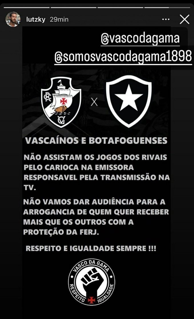 Simplesmente o Storie do Jon Lutzky, sócio da 777, dizendo para vascaínos e botafoguenses não assistirem jogos do Urubu e Fluminense na Band.