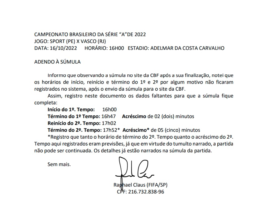 O juiz Raphael Claus fez uma retificação na Súmula de Sport 1 x 1 Vasco, que permite a interpretação de que a partida foi interrompida, e não finalizada por completo.