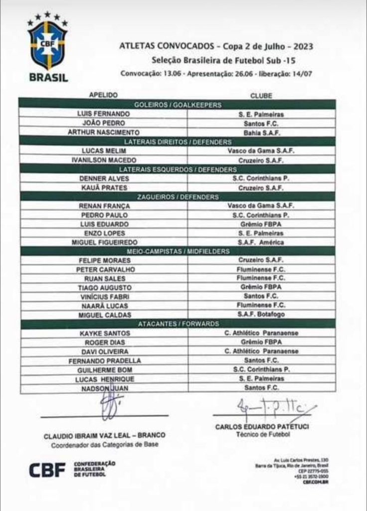 Segunda convocação do técnico Dudu Patetuci da Seleção Sub-15 que se prepara pro Sul-Americano infantil.