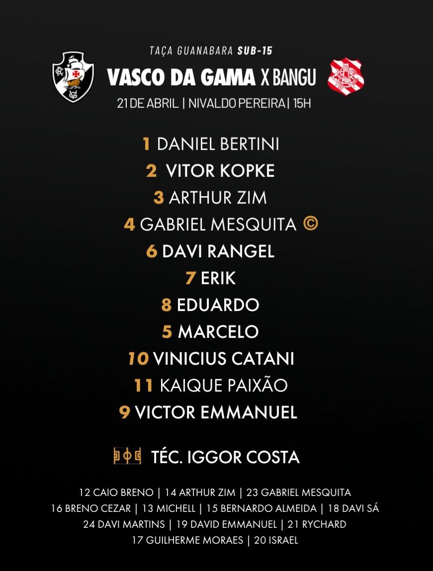 O Sub-15 do Vasco está escalado para enfrentar o Bangu, às 15h, no Nivaldo Pereira, pelo Carioca. O time não contará com os meias Ariel Gomes e Diego Bento, que estão servindo a Seleção da categoria. Oportunidade pra ver o jovem Vinicius Catani como titular na Vasco TV.