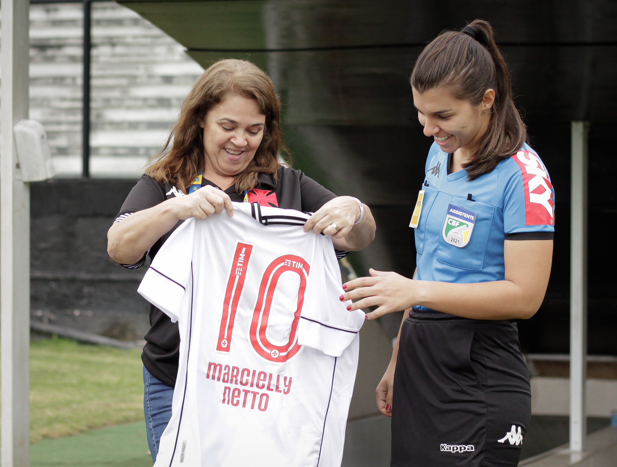 Uma das auxiliares da arbitragem do segundo jogo da final da Copa do Brasil, Marcielly Netto, recebeu uma camisa do Vasco da Coordenadora Opercional das categorias de Base, Cida Cazote, funcionária com mais de 20 anos de casa, após a partida.
