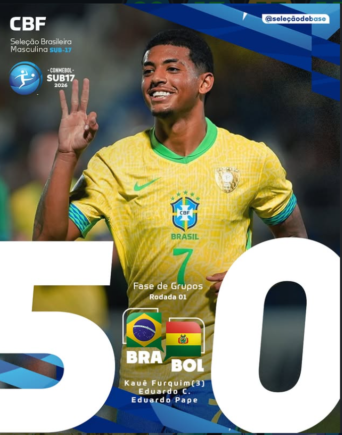 A Seleção Brasileira Sub-17 vence a Bolívia por 5 a 0 com gols de Kauê Furquim (3), Eduardo Conceição e Eduardo Pape.