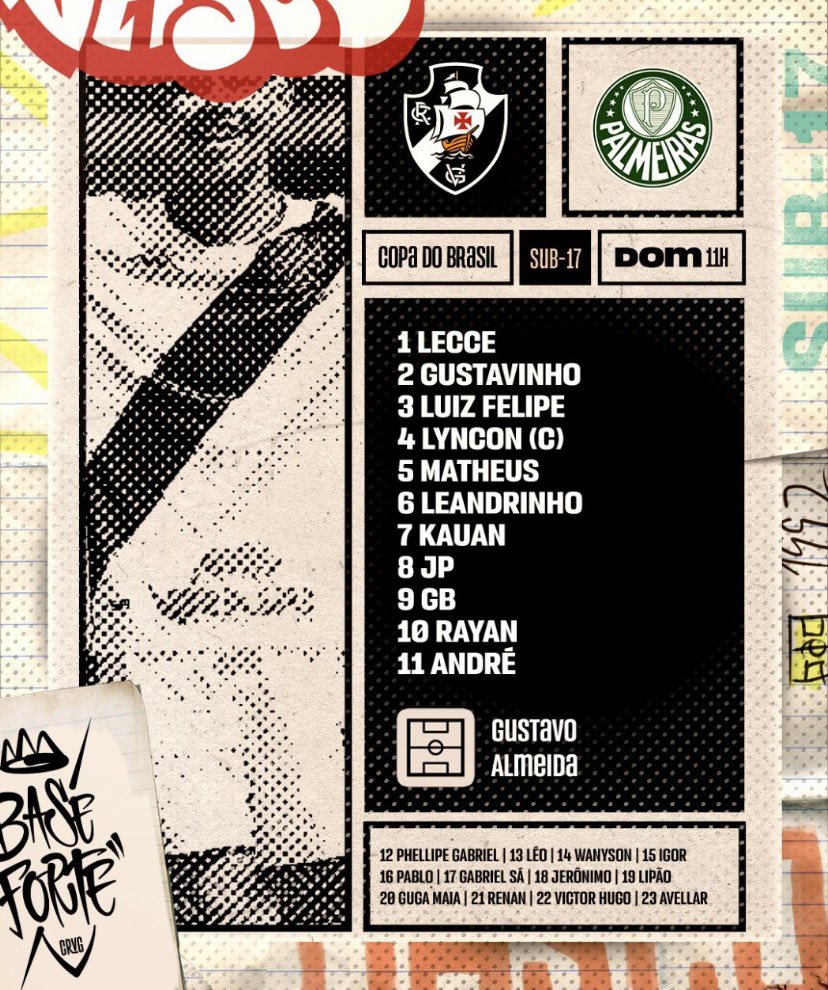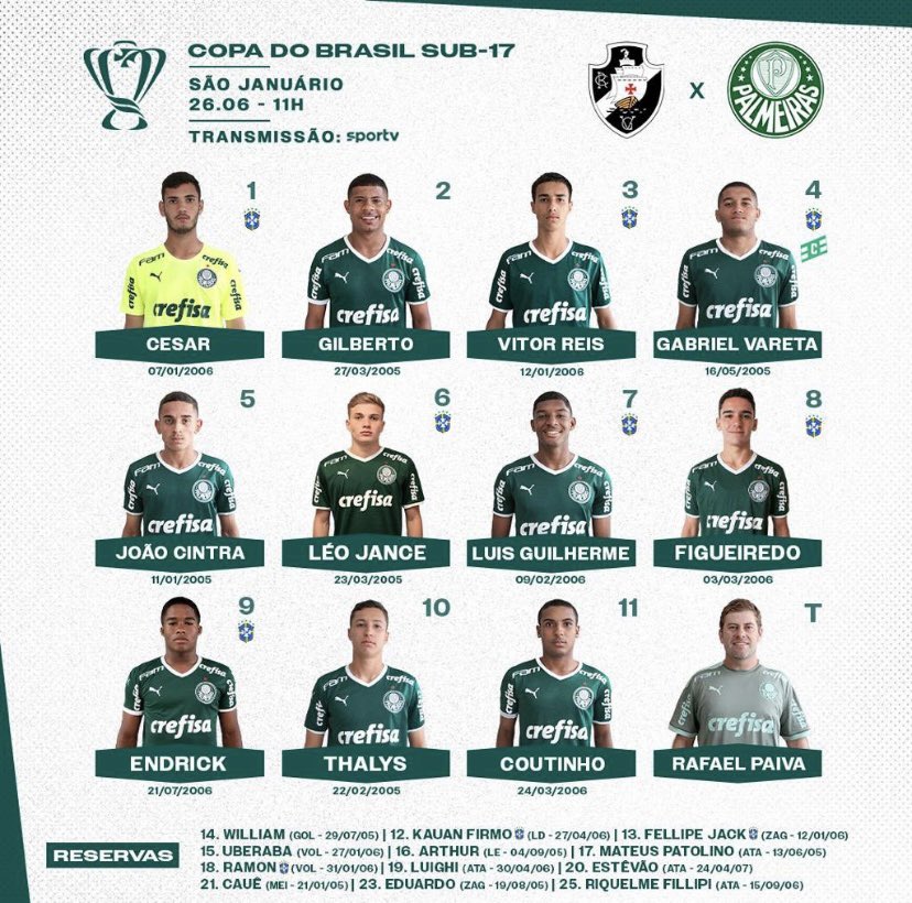 Vasco e Palmeiras definidos para decisão da Copa do Brasil sub-17. Time carioca tem dois desfalques importantes. Estrella e Paulinho se lesionaram no primeiro jogo e estão fora. Rayan volta ao time titular #trcolina